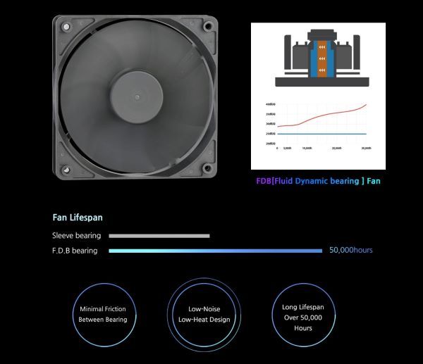 Підшипник FDB (Fluid Dynamic Bearing) відрізняється низьким рівнем шуму та тривалим терміном служби. Він швидко відводить внутрішнє тепло і забезпечує достатнє охолодження при низькій частоті обертання для максимально стабільного та безпечного живлення.