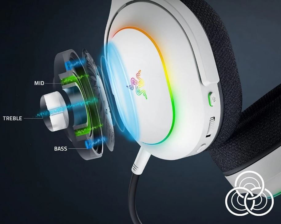 RGB-підсвічування з шістьма зонами на чашках створює унікальні світлові ефекти, перетворюючи гарнітуру в виразний елемент ігрового сетапу. Підтримка технології Razer Chroma RGB з палітрою 16,8 мільйона кольорів і безліччю ефектів забезпечує повну кастомізацію і синхронізацію з більш ніж 300 іграми і 500 пристроями.