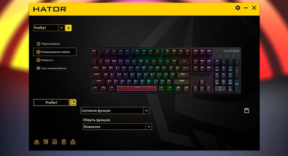 Клавіатура Hator дозволяє налаштувати інтерфейс під власні вподобання. Всі символи на клавішах мають повну підсвітку, що забезпечує зручність використання в умовах низького освітлення. Підсвітка підтримує різноманітні режими та рівні яскравості, які можна легко налаштувати за допомогою програмного забезпечення.