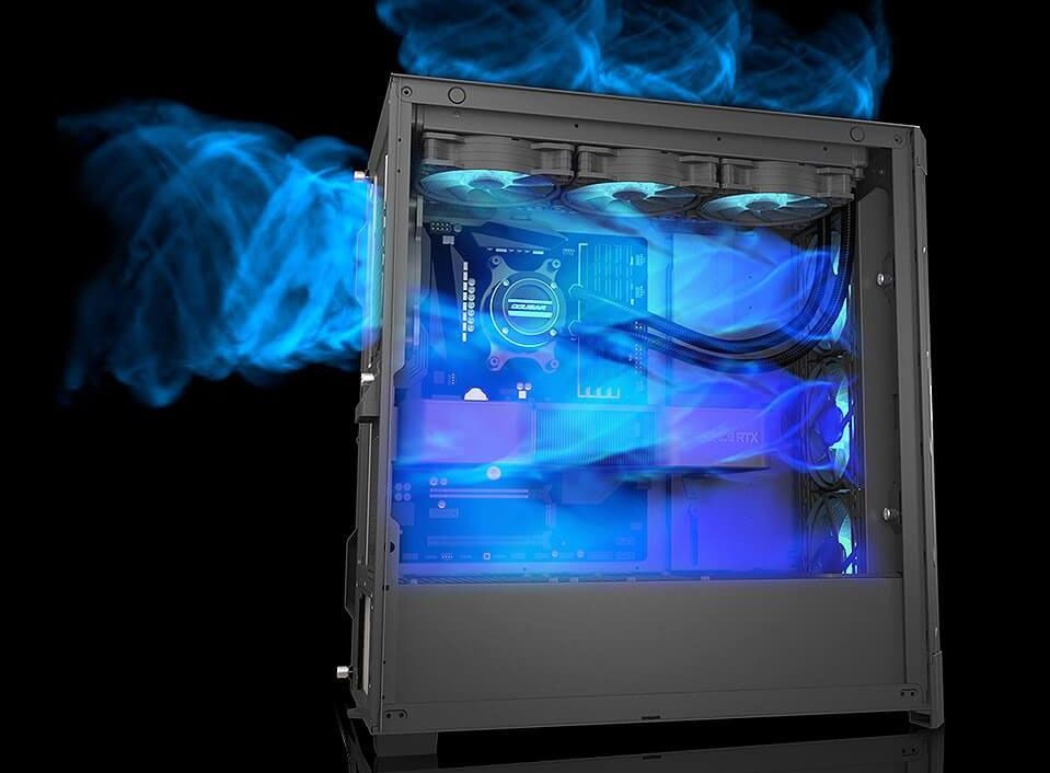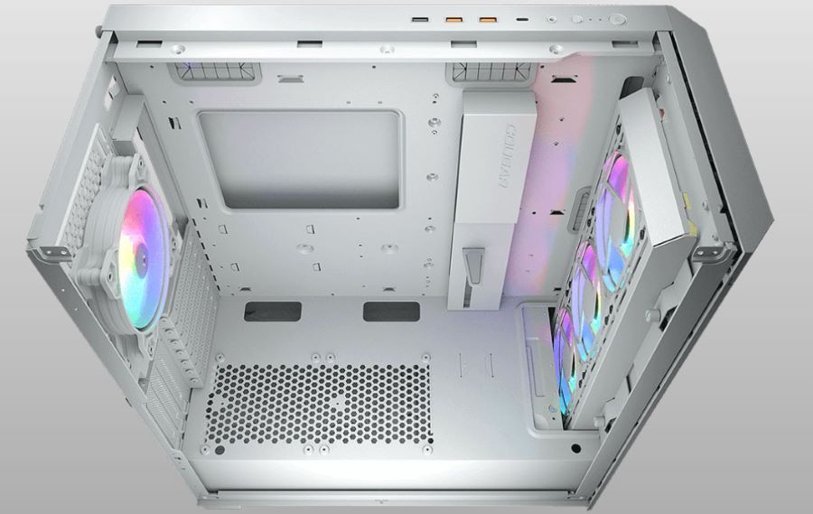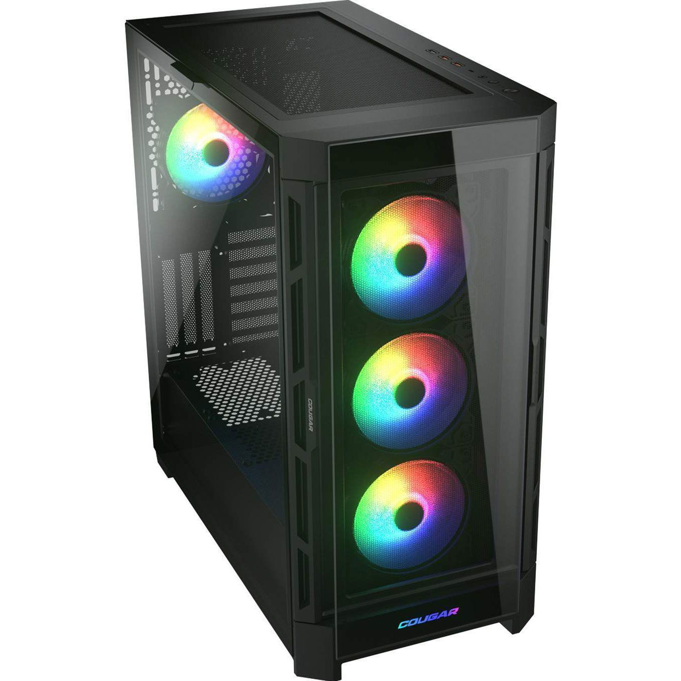 Cougar Duoface Pro RGB оснащений чотирма 120-мм ARGB-вентиляторами та підсвіченим логотипом, які створюють виразний візуальний ефект. Керування підсвічуванням здійснюється за допомогою окремої кнопки, що дозволяє швидко перемикати режими. Підтримка синхронізації з 5V ARGB-роз’ємами материнської плати забезпечує єдиний стиль усієї системи.