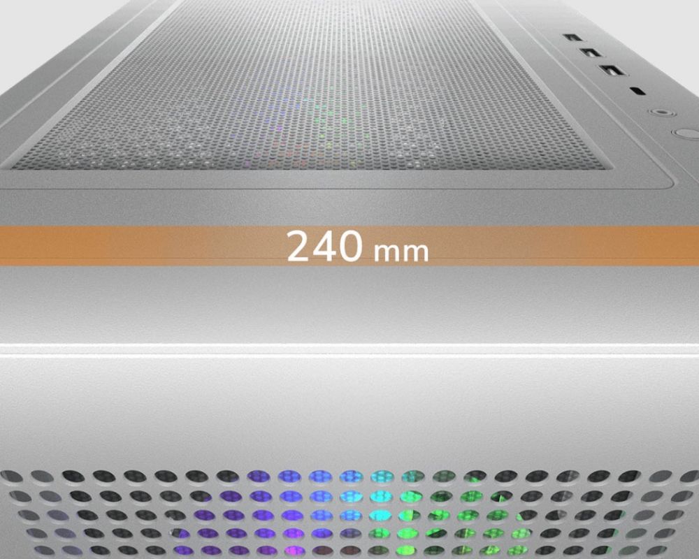 Ширина корпусу 240 мм надає достатньо місця для встановлення масивних комплектуючих. Усередині легко розміщуються материнські плати формату E-ATX, відеокарти довжиною до 390 мм і кілька накопичувачів. Підтримка до дев’яти вентиляторів, великого радіатора водяного охолодження та високих процесорних кулерів дозволяє ефективно справлятися з тепловим навантаженням навіть у продуктивних конфігураціях.
