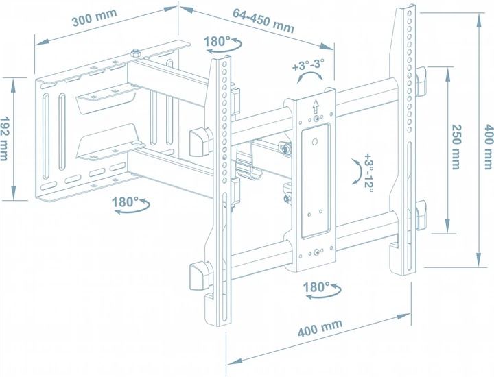 Мінімальна регульована відстань від стіни становить 64 мм, а максимальна 450 мм. У кронштейні передбачений рівень для точного встановлення.