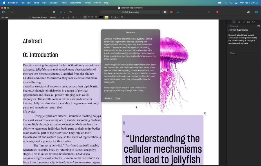 Writing Tools вичитує ваш текст, створює різні версії та допомагає досягти ідеального тону і формулювання. Ви можете швидко резюмувати обраний текст одним клацанням миші, що особливо корисно для ефективної роботи з документами.