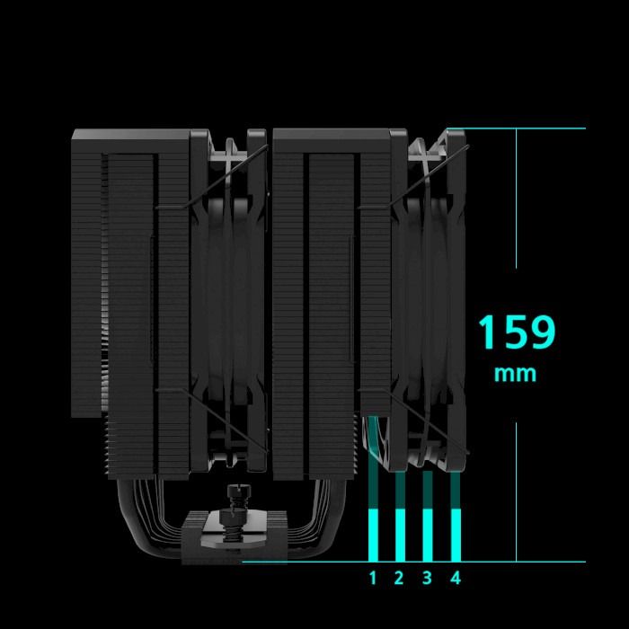 CNPS14X Duo забезпечує 44-міліметровий зазор для стандартної оперативної пам'яті та максимальну висоту 52 мм завдяки вирізаному дизайну ребер. Налаштуйте вентилятор на потрібну висоту для слотів оперативної пам'яті з можливістю розгону. Висота 159 мм, сумісна з більшістю корпусів.