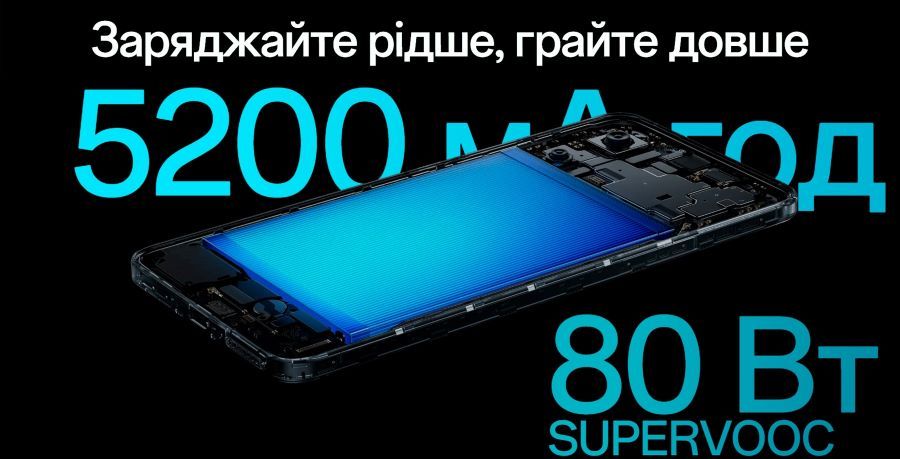 Акумулятор ємністю 5200 мА·год забезпечує тривалий час роботи — перегляд фільмів, ігри, спілкування, навігація — усе без постійних пошуків розетки. Завдяки технології SUPERVOOC потужністю 80 Вт смартфон заряджається надзвичайно швидко — достатньо кількох хвилин, щоб отримати години активної роботи. Режим Bypass Charging дозволяє живити пристрій безпосередньо від адаптера, минаючи батарею. Це знижує нагрівання корпусу, запобігає тротлінгу й продовжує термін служби акумулятора — ідеальне рішення для геймерів або тих, хто часто користується смартфоном під час зарядки.