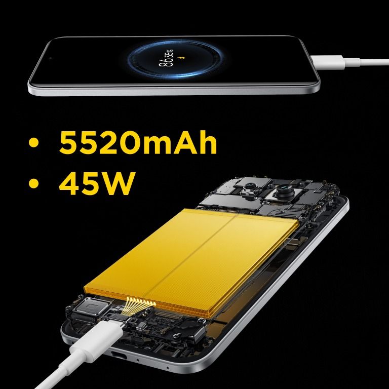 Акумулятор ємністю 5520 мА·год дозволяє впевнено користуватися смартфоном протягом усього дня без дефіциту заряду. Ти можеш дивитися відео, грати чи працювати — запас енергії розрахований на будь-які інтенсивні сценарії. Підтримка швидкої зарядки потужністю 45 Вт забезпечує оперативне відновлення заряду: кілька хвилин на підзарядці дають години активної роботи. Інтелектуальна система керування живленням оптимізує процес зарядки, знижує теплове навантаження та подовжує термін служби батареї, зберігаючи її ефективність навіть при тривалому використанні. У будь-яких умовах ти отримуєш стабільне й безпечне живлення, що робить пристрій надійним партнером у динамічному ритмі життя.