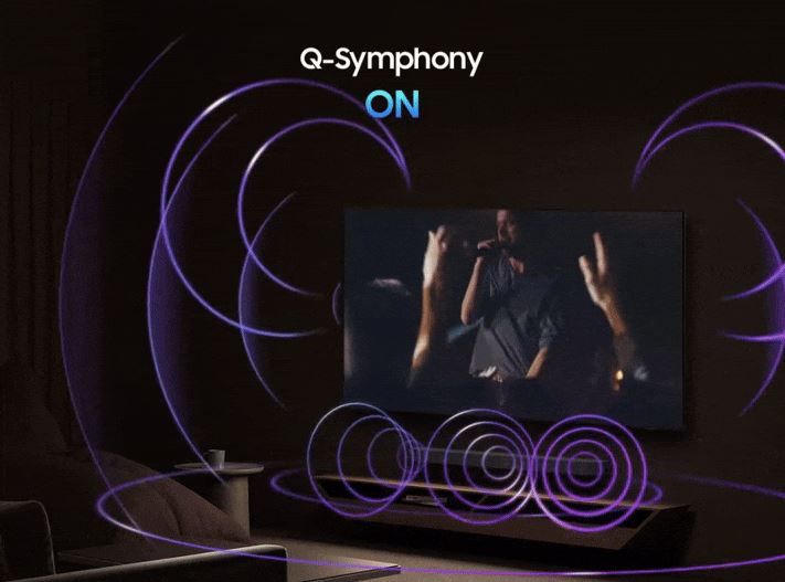 Q-Symphony синхронізує відтворення аудіо між вбудованими динаміками телевізора та сумісного саундбара, забезпечуючи звучання обох пристроїв одночасно. Забудьте про необхідність вимикати динаміки телевізора – тепер звук наповнює простір рівномірно, створюючи ще більш масштабне аудіо. Ідеальне поєднання для кінематографічного досвіду вдома.