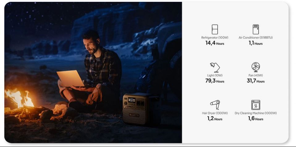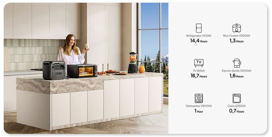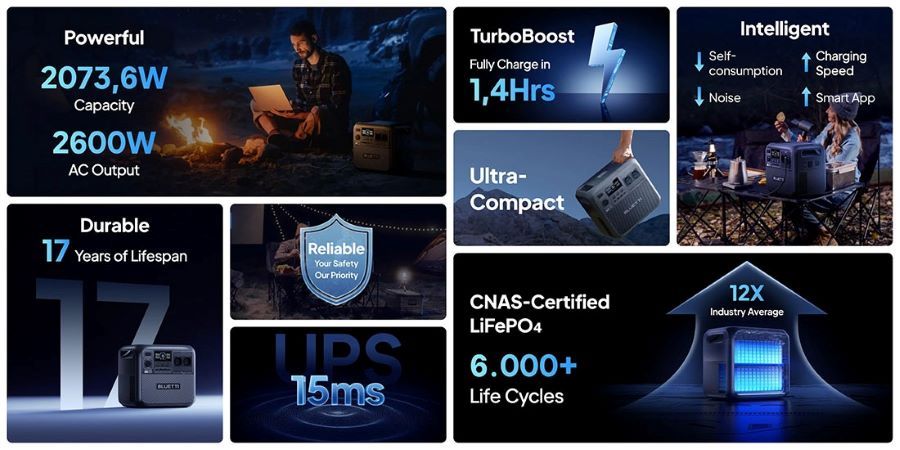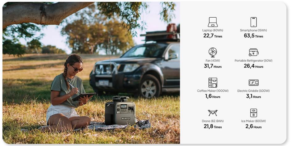 З технологією TurboBoost пристрій заряджається на 80% всього за 1 годину. В дорозі ви можете використовувати сонячну енергію і повністю зарядити його приблизно за 2,4 години. Спеціальний BLUETTI Charger 1 забезпечує зарядку в 6 разів швидше, ніж звичайні автомобільні адаптери, а підключення до мережі 2300 В дозволяє миттєво відновити запас енергії.