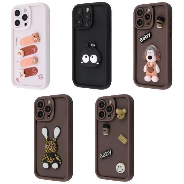 Силиконовый чехол с уникальным дизайном. Украшен 3д фигурками: пончики и кофе, кролики и мишки и различные мультяшные персонажи.