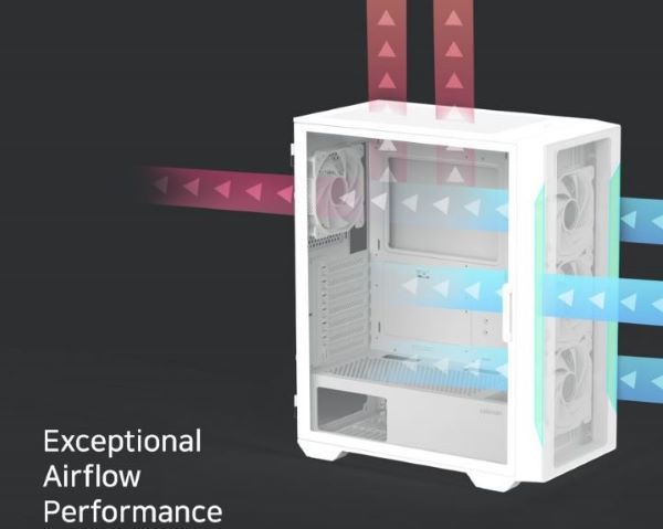 Установленные четыре 120-мм вентилятора с ARGB-подсветкой обеспечивают активный воздушный поток для охлаждения внутренних компонентов. Продуманное размещение вентиляционных зон (передняя, верхняя, нижняя, задняя панели) позволяет масштабировать систему охлаждения в зависимости от потребностей.