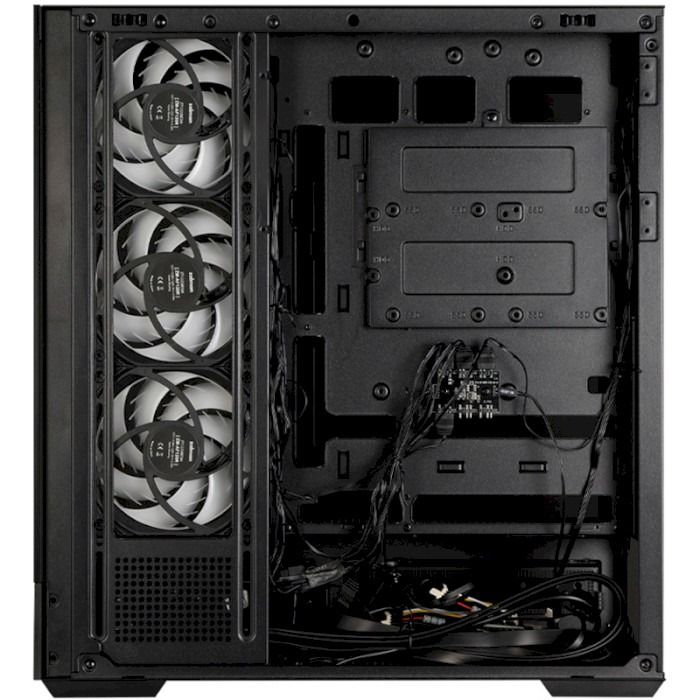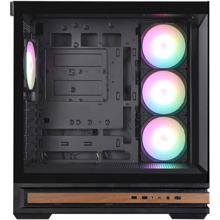 Корпус поддерживает реверсивную компоновку материнской платы, при которой все разъёмы располагаются в нижней части, обеспечивая минималистичный внешний вид и удобную укладку кабелей. Такой подход не только повышает эстетичность сборки, но и облегчает обслуживание. Просторное внутреннее пространство позволяет установить видеокарты длиной до 420 мм, кулеры высотой до 165 мм и блок питания длиной до 150 мм. Система креплений без использования инструментов обеспечивает лёгкий доступ ко всем компонентам, а боковая панель легко снимается благодаря специальным пазам в нижней части стекла, что делает сборку максимально удобной.