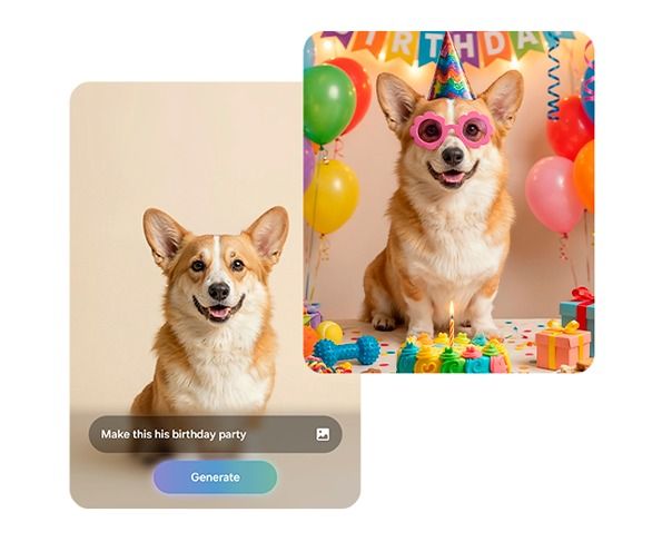 Редактируйте фото быстро и легко, используя несколько слов и AI. Добавляйте на фото своего любимца аксессуары и другие элементы, просто описав желаемые изменения, и Galaxy AI реализует ваш замысел в считанные минуты.