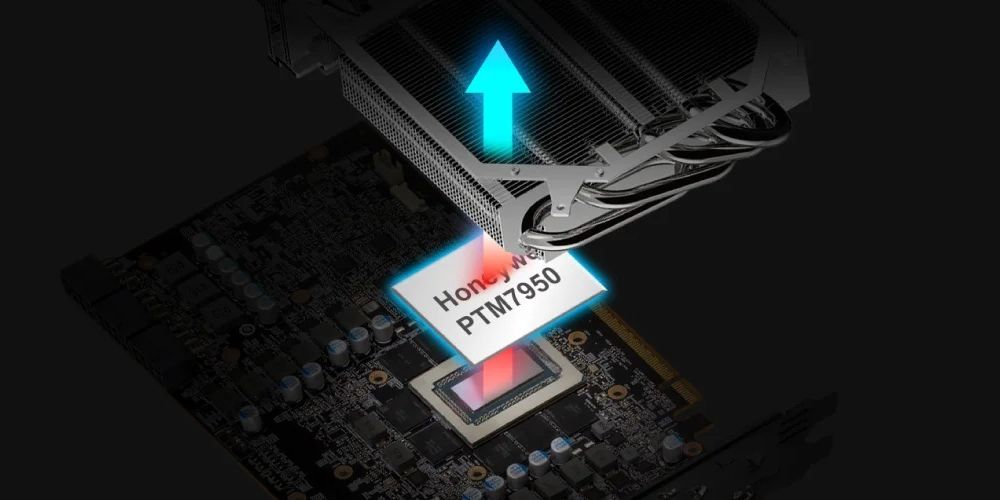 Фазоизменяемый материал PTM7950 заполняет микрозазоры между GPU и радиатором, значительно увеличивая эффективность охлаждения во время максимальных нагрузок.