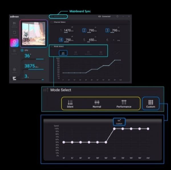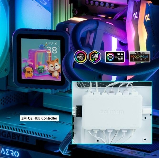 Цвет и анимации можно синхронизировать с материнской платой и настраивать через ПО ZM-OZ. В комплекте есть контроллер ZM-OZ HUB, который позволяет подключать до шести PWM и ARGB-вентиляторов и синхронизировать их с подсветкой системы.